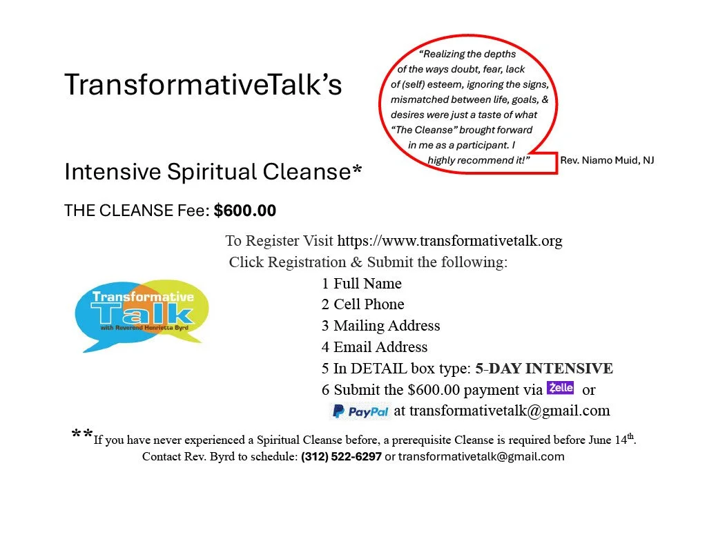 Spiritual Cleanse sessions are available upon request for groups of twenty or less